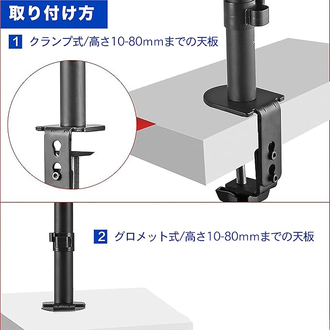 ✔【商品仕様】対応規格: 13~32インチ;耐荷重:8KG;VESA:マウントインターフェイス規格;対応デスク厚さ:クランプ式---10mm~80mm、グロメット式---10mm~80mm;