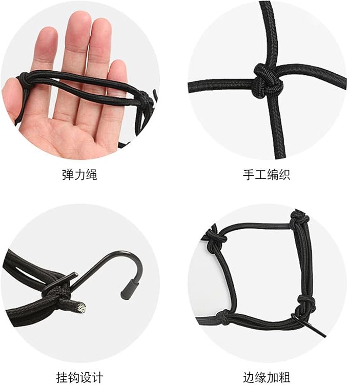 【適用シーン】● バイクツーリング:長距離移動時の荷物固定。● 自転車の荷物運搬:前カゴ・後部キャリアの荷崩れ防止。● アウトドア&キャンプ:テントやキャンプギアの固定に。● 車のトランク整理:ラゲッジネットとして活用。