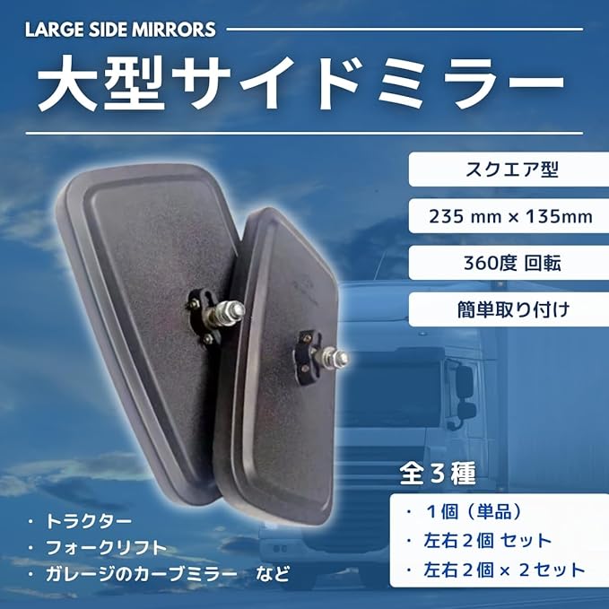 karim サイドミラー 大型 バックミラー カーブミラー 黒 スクエア型 角型 フォークリフト トラクター 農機 重機 建機 トラック 鏡 汎用 360度回転 (1個(単品))
