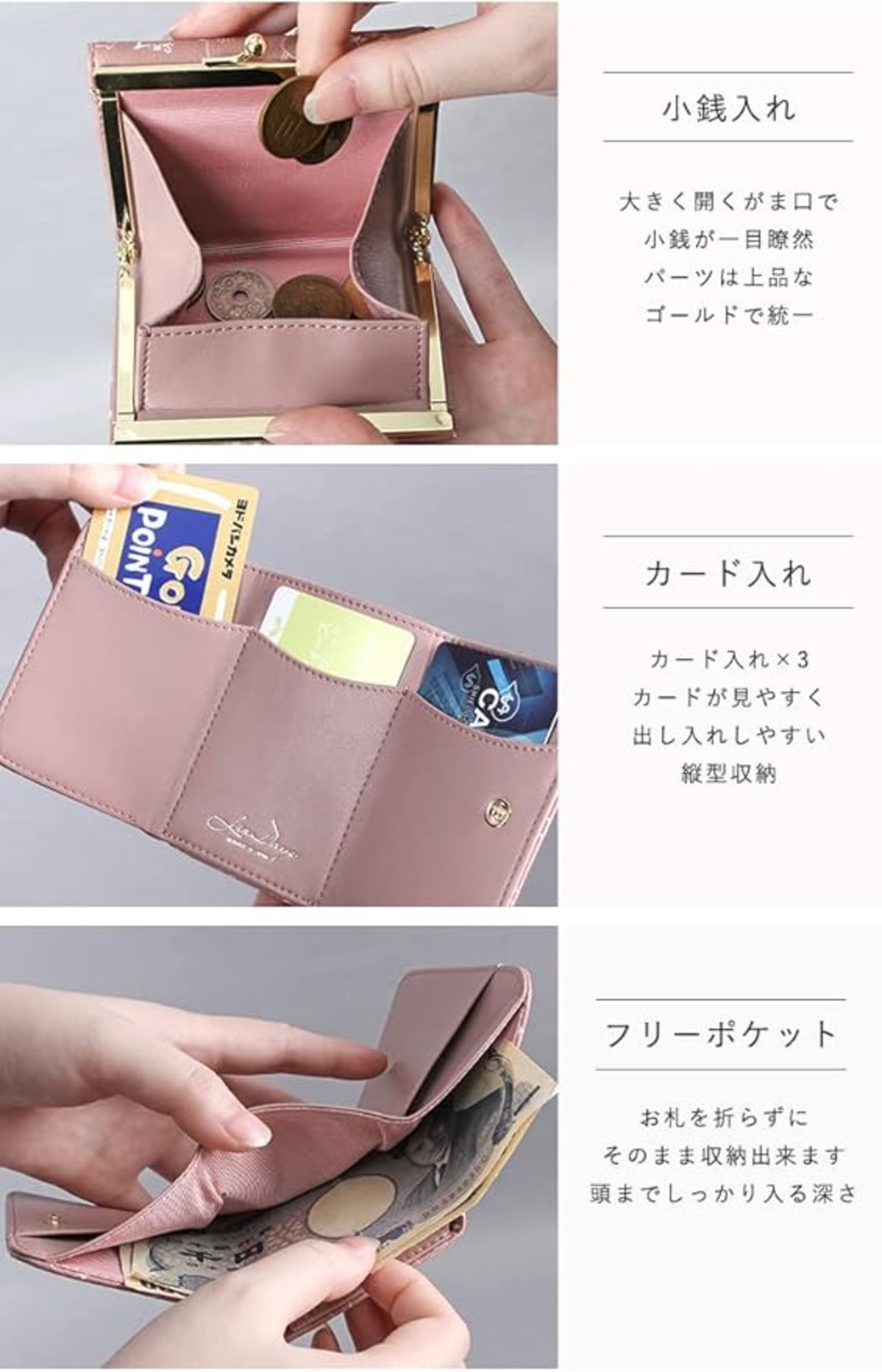 財布の中はお札を折らずにしまえるフリーポケット、 カードが3枚立ててしまえるカード入れ そしてがま口で開閉出来る小銭入れがついてます