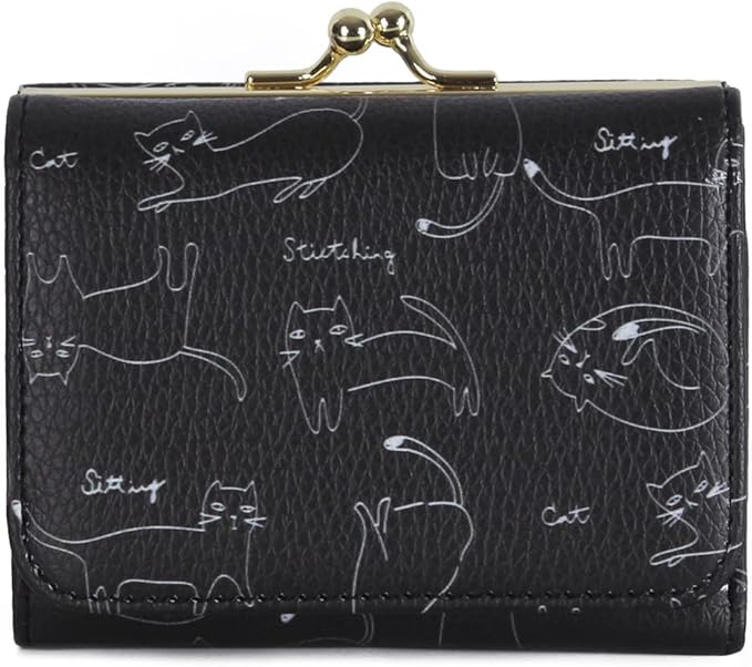[リズデイズ] 財布 ミニ財布 三つ折り財布 レディース カード入れ 小銭入れ 猫 ネコ 総柄 (ブラック)