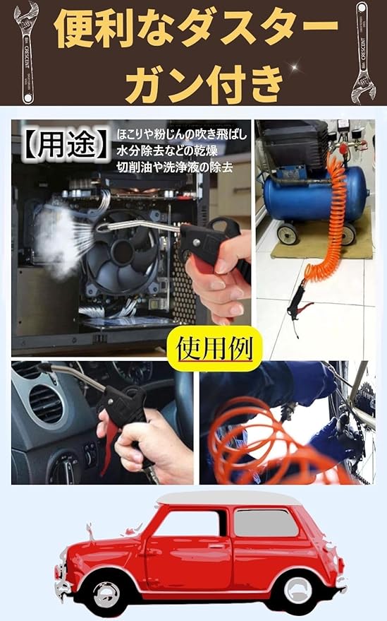 エアー工具用ホースとエアブローガンとエアー調整のセットは、洗車後の水飛ばし ナットの水飛ばし 車の埃飛ばし DIYでエアブロー 模型塗装時の埃を飛ばし ポリッシャーバフ掃除 掃除機のフィルター掃除 グリルやライト周りの溝塵飛ばし 車の隙間の汚れ飛ばしなど手が入りにくい細かい埃や塵などの飛ばしなど色々な用途にお使いいただけます。
