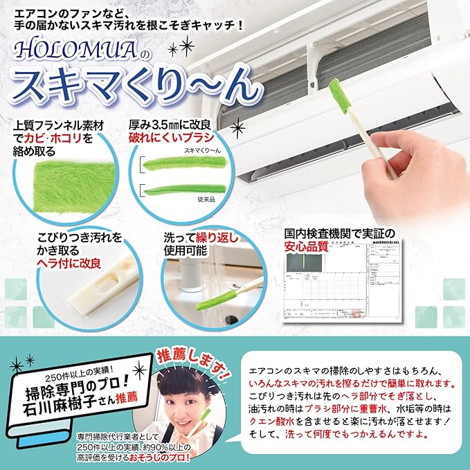 【掃除専門プロの家事代行業者 推薦】HOLOMUAの エアコン掃除 ブラシ は毎日のお掃除を簡単でラクにして頂くために日本企業が商品開発を行っています。上質なフランネル素材を採用することで、これまで手の届かなかった狭いエアコン ファン (シロッコファン)の隙間の奥まで届きカビ・ホコリの汚れを絡め取ります。