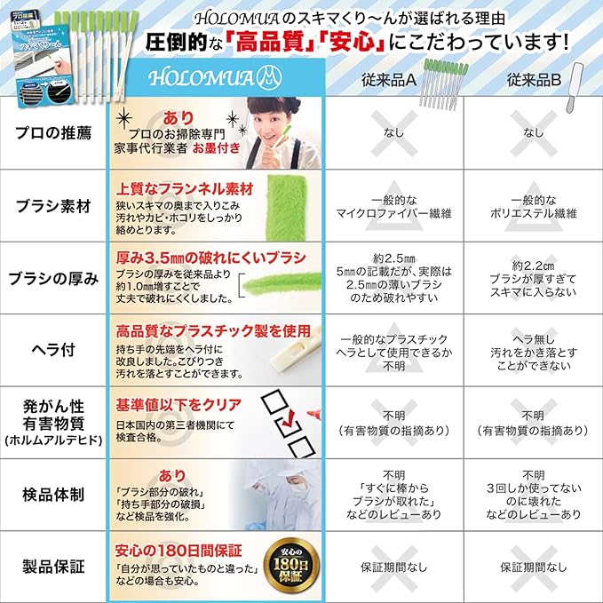 【安心の180日間長期保証】「インターネットでの買い物は、実際に商品を手に取って触って選べないから不安…。」 そんなお客様にも安心してお選び頂けるよう、HOLOMUAでは独自の180日間長期保証対応を行っています。万が一、当社の 掃除 ブラシ ( 隙間ブラシ )にご満足いただけない場合や、商品に不具合があった場合はお気軽にご連絡ください。すぐに交換・返金等の対応を取らせて頂きます。