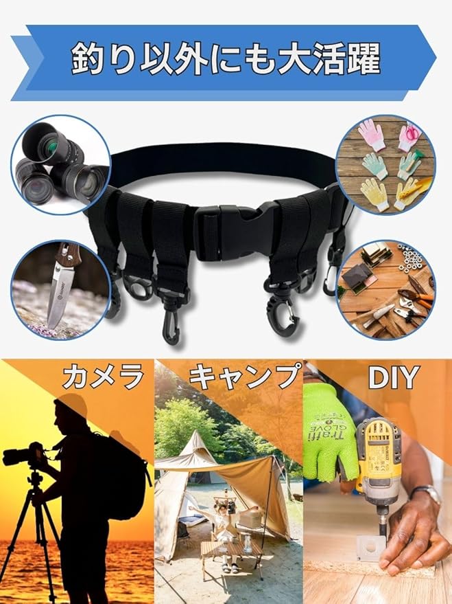 【多用途に使用可能】釣りの際の小物の収納はもちろん、カメラマン用ベルトとしてレンズケースやアクセサリーなどの小物をぶら下げたり、キャンプの際にはナイフや火おこし道具、ライドを掛けておいて必要な時にサッと使うことができます。その他、DIYツールやガーデニングの剪定ハサミ、登山やハイキングの時に使う小型の水筒やトレッキングポールホルダーなど、使い方は多種多様です。シンプルなデザインなので趣味や仕事に幅広くお使いいただくことが可能です。