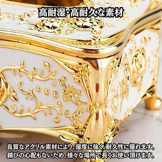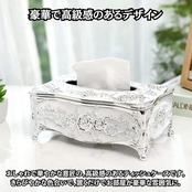 【ゴージャスなティッシュケース】薔薇の意匠が美しい、高級感のあるティッシュケースです。きらびやかな色合いで、お部屋に置くだけで豪華な雰囲気を演出します。表面は立体感のあるレリーフ調の意匠で、上品さを感じる仕上がりとなっております。