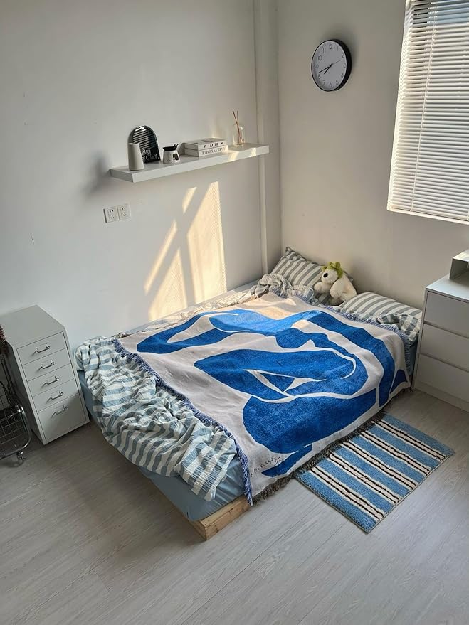 シンプルで少し寂しいと感じるベッドルームのインテリアにおすすめなベッドスロー。 ソファやイスに掛けたり、ラグとしても多様に活用して頂けます。 こちらは19~20世紀に活躍したフランスの画家兼彫刻家、“アンリマティス Henri Matisse ”の作品ブルーヌードのデザインを取り入れたものです。マティスが好きな女性のポーズを切り絵で表現しています。 裏表で色が反転するリバーシブルデザインですので、気分やインテリアに合わせて使い分けて頂けます