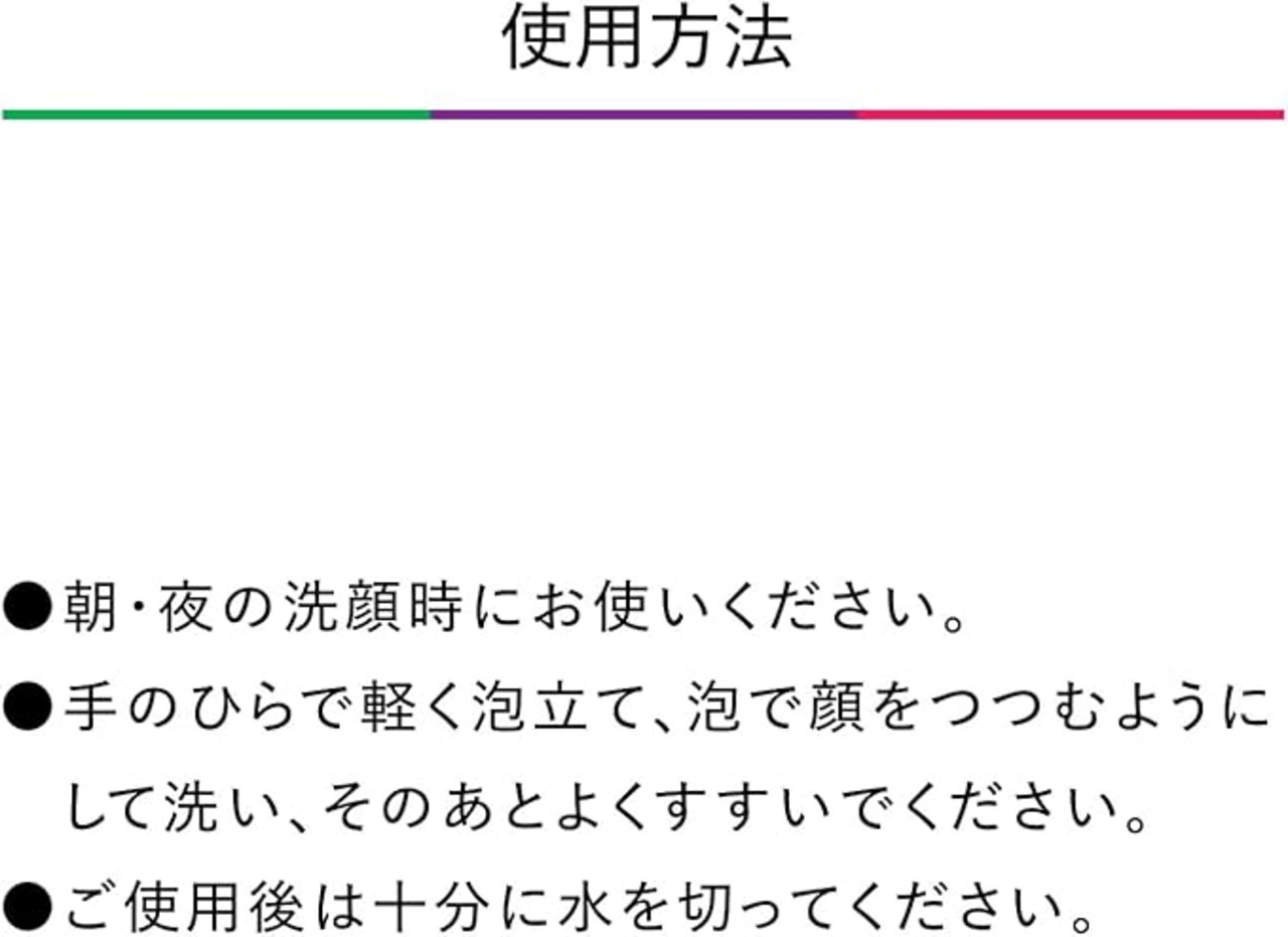 朝・夜の洗顔時にご使用ください。 手のひらで軽く泡立ててから、泡で顔を包むようにして洗い、そのあとよくすすいでください。 ご使用後は十分に水を切ってください。