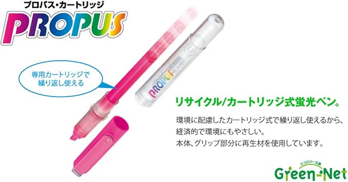 カートリッジ式で繰り返し使えるから、経済的で環境にもやさしい蛍光ペンプロパスカートリッジ専用の詰替インクです。また、本体グリップ部分には再生材を使用しています。