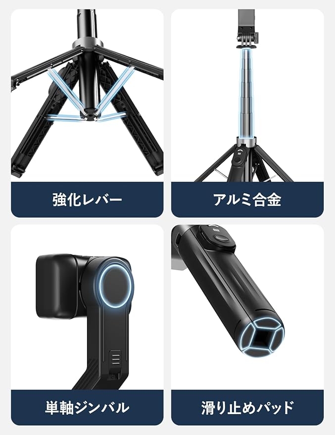 【1本で3役 |自撮り棒・ジンバル・三脚】このジンバルは、最大101cmまで伸ばせる8段伸縮式セルカ棒として使えるだけでなく、底部のハンドルを開くだけで自立式四脚スタンドに変身。生放送やビデオ通話の時両手を解放でき気楽にお話でき、スマホスタンド、卓上スタンドとして使用してもいいです。多機能による汎用性の高さ、様々な撮影シチュエーションへの対応力、持ち物の最小化(3役1本で済む)、アウトドアや旅行の必需品です。