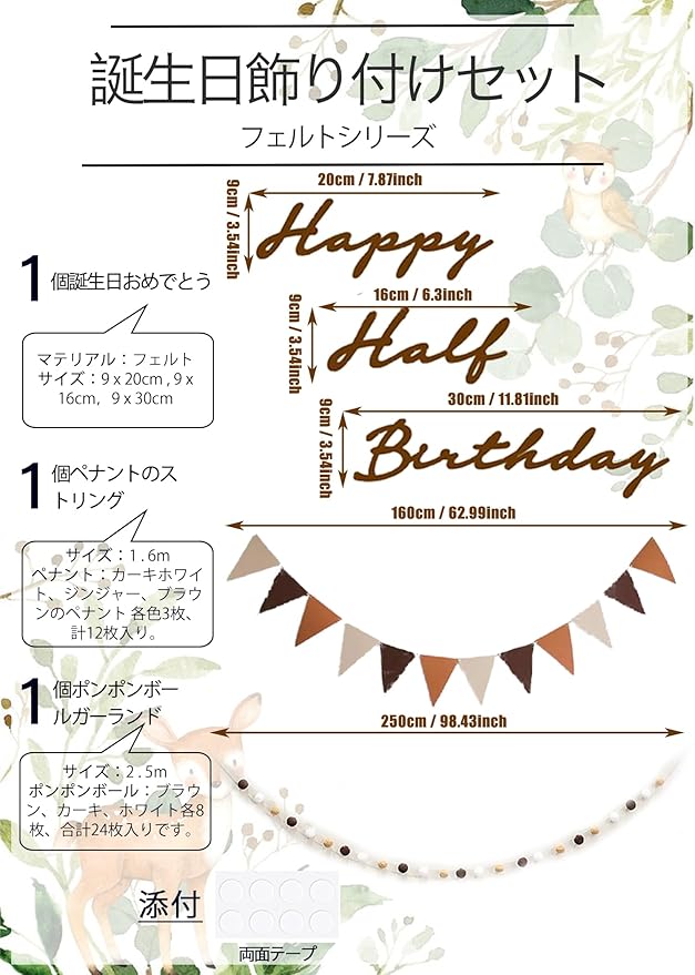 充実のセット内容  ハーフバースデーhappy half birthdayフェルト生地バナーx1、160cm フェルト生地フラッグガーランドx1、250cm フグボールガーランドx1。質が高いですので、きちんと保存すれば、後にも持続に使用でき、コスパが高いです。