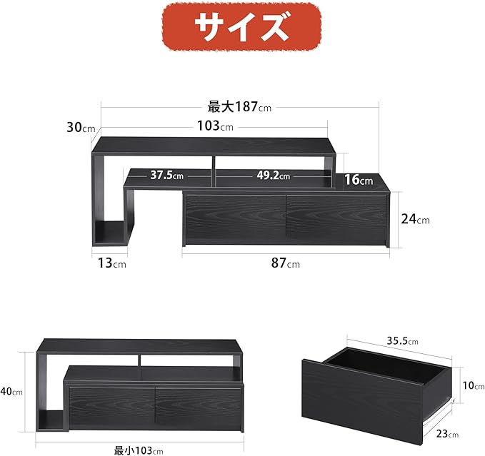 【自由な横幅】横幅が103~187cmの間で自由に調節出来る伸縮機能付きのテレビ台です。最大47Vのテレビを対応できます。