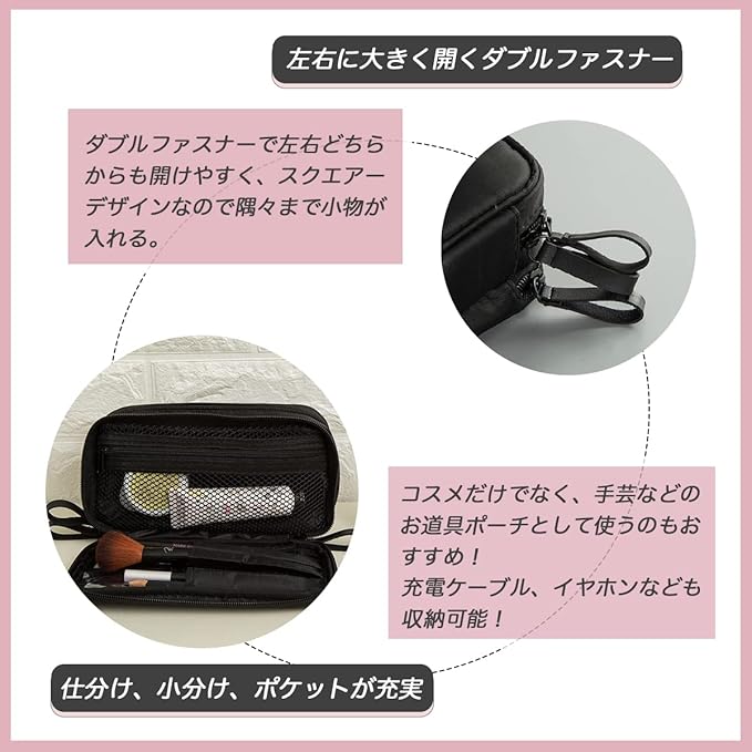 Rajjo 化粧ポーチ 二層 ポケット 機能的 ダブル ファスナー メイク ポーチ コスメ 収納 小物入れ (ブラック/ブラック)