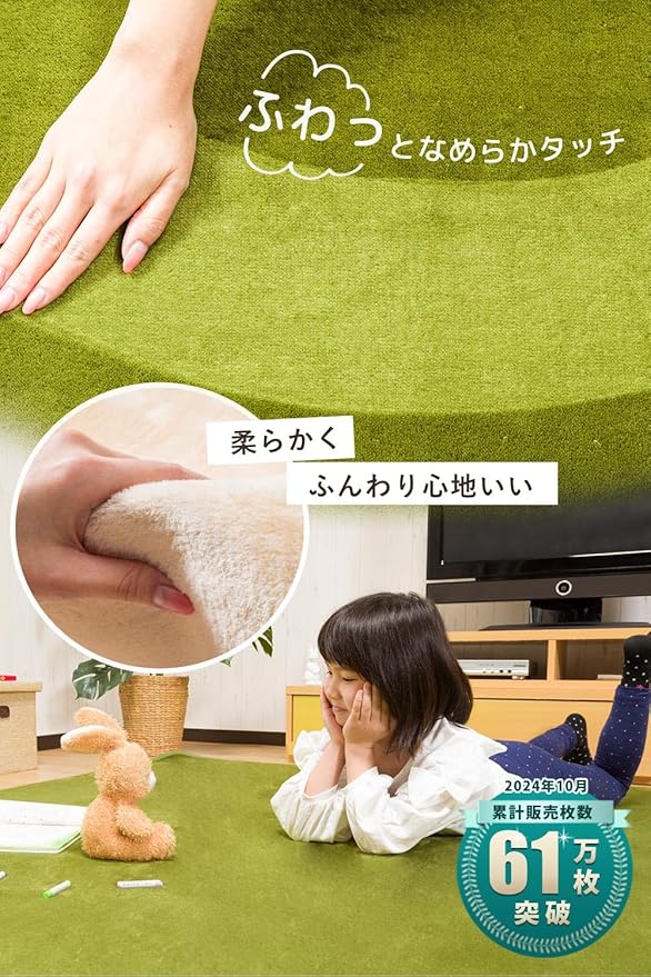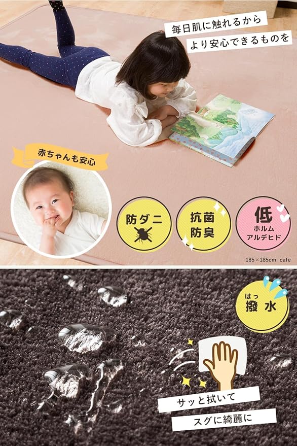 【子供に安全安心!肌に優しい素材を使用】ふと横になって寝転がったり、足や手も触れることが多いラグマット。毎日肌に触れるものなので、安心してご使用いただけるよう抗菌防臭防ダニ加工を施しております。さらには低ホルムアルデヒドの試験をクリアしているので、小さなお子様や赤ちゃんがいるご家庭でも安心してご使用頂けます。