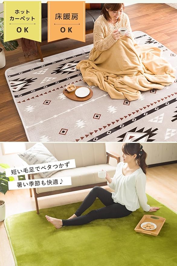 【一年中ずっと使い続けられるラグ】耐熱加工を施しているため、冬はホットカーペットや床暖房と併用して暖かい空間に。夏などの蒸し暑い日でも、毛足が短いのでべたつかず、さらさらで気持ちいい肌触りとなります。豊富な色味やサイズを揃えているので、季節によって色を変えてお部屋の模様替えとしてもいかがでしょうか?