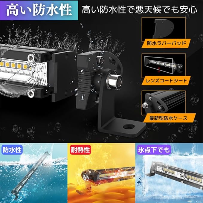 【仕様】サイズ(約):120w 33cm 5cm 3cm / 素材:アルミニウム合金製(本体) / 動作電圧: 9-30V DC(12V / 24Vに適合) / 消費電力: 60W120W/1個 / 防水性能: IP68 / ルーメン:8000LM 12000LM/1個 / 色温度: 6500K / LEDバルブ寿命: 30000時間以上 / セット内容: LEDライト1個(取付ネジ1式)