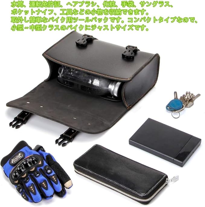 サイズ:約21 x 10 x 10cm。水筒、運転免許証、ヘアブラシ、化粧、手袋、サングラス、ポケットナイフ、工具などの小物を収納できます。取外し簡単なバイク用ツールバックです。コンパクトタイプなので、小型~中型クラスのバイクにジャストサイズです。