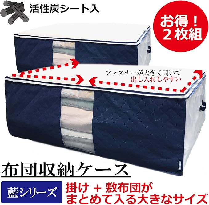 【通気性の良い布団/衣類収納ケース】通気性の良い厚手不織布製。前面に活性炭シートを加工し、大切な布団や寝具、衣類や小物などをにおい・ホコリ・汚れから守ります