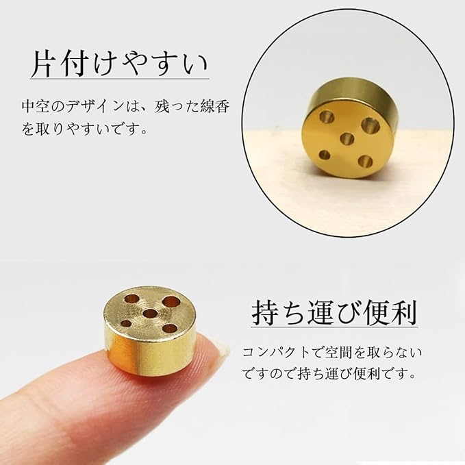 素材:真鍮 サイズ:(円筒形)直径1.2cm*高さ5.6mm, 穴サイズ:2mm、1.6mm、1.2mm 、1mm パケージ内容:ミニお香立て*1個 ミニサイズなので、コンパクトで持ち運び便利です。