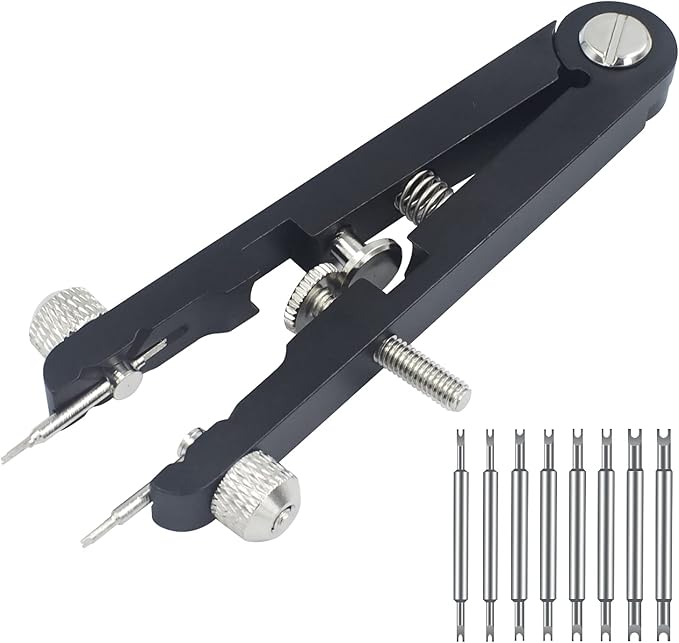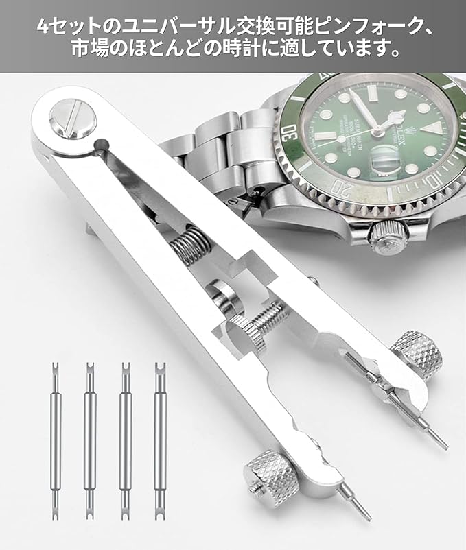 長さは10CMで、ツールには4セットのユニバーサル交換可能ピンフォークが含まれ、4つの異なるリバーシブルピンエンドフォークサイズのオプションがあります。ツールは、最大30mm(5mm〜30mm)までの任意のスプリングバー幅に調整できます。時計ケースのラグ、時計のブレスレット、バンド、またはストラップの間に収まります。市場のほとんどの時計限定商品に適しています。