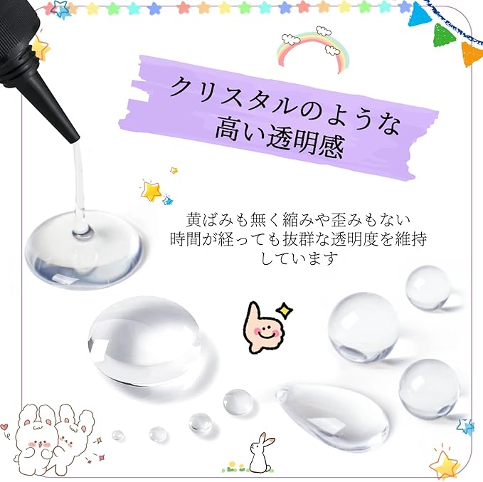 【急速硬化】エポキシレジンに比べて、硬化時間は短く、UVライトに当たって2分ほどかかると硬化できます太陽光でも硬化させることができて、せいぜい5分以内です短時間でキレイな仕上がりをお楽しみいただけますノズルのデザインで液体をモールドに注ぐのに役立ちますノート:色料を入れすぎて紫外線がレジン液に当たらずに硬化不良を起こしますため、ご注意ください