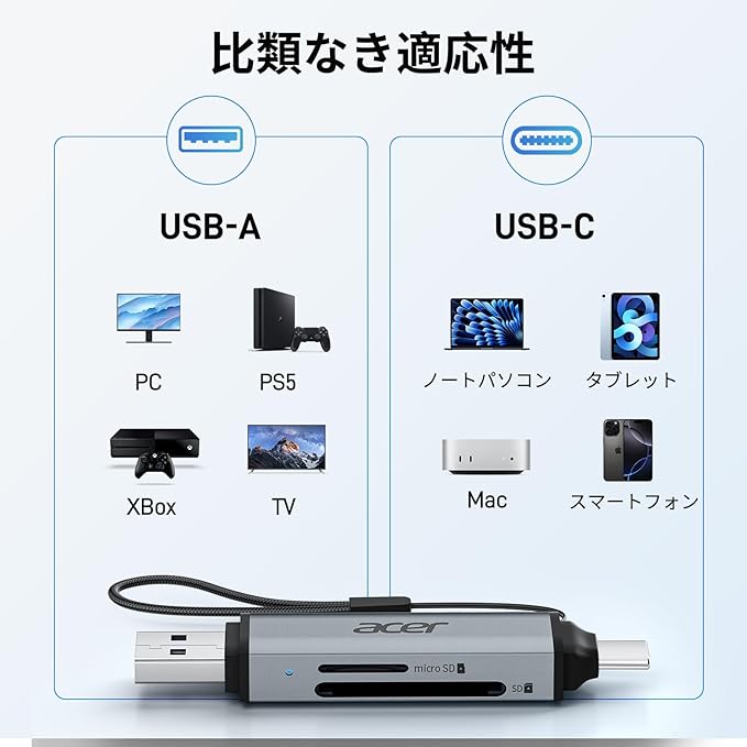 【USB 3.0 + USB-C】Acerのメモリーカードリーダーは、USB-AおよびType-Cの2つのインターフェースを搭載した多機能SD/TFカードリーダーです。USB-AまたはUSB-C対応デバイスと幅広く互換性があり、最大5Gbpsの高速転送に対応。1GBのファイルも数秒で移動できる、利便性の高いカードリーダー SDです。