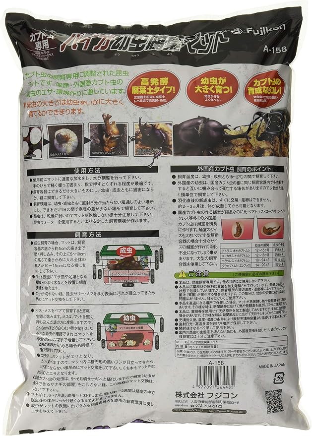 高発酵腐葉土タイプ! ・カブト虫の飼育専用に調整された昆虫マットです。 ・天然木を粉砕し腐葉土レベルまで発酵・熟成させていますので国産・外国産カブト虫の幼虫のエサ・成虫の飼育環境作りに適しています。