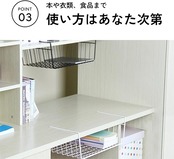 【商品仕様】サイズ:40*23*14cm カラー:ホワイト 耐荷重:約5kg 表面処理:焼付け塗装。厚さ3cm以内の吊戸棚の底板などに差し込んで使えます。