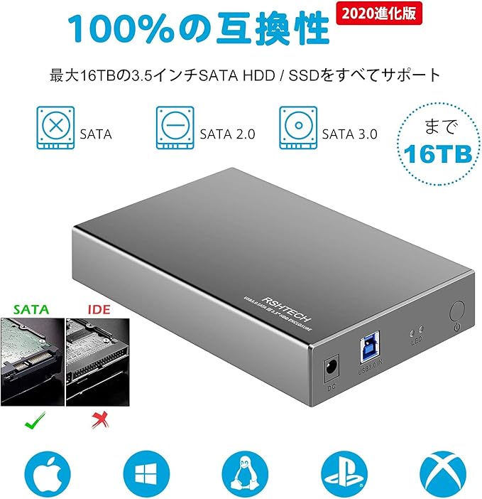 【広範な互換性】本ハードディスク 外付けケースは全ての3.5 インチ SATA I/II/III/HDD SSD 最大 16 TB に対応。Windows 2000/XP/Vista/Windows 7/8/10、Mac 9.0 及びそれ以降のバージョンにサポートする。テレビやPS4、PS4 Pro、Xbox 360、Xbox oneと互換性があります。使用前に、すべてのケーブルとポートの接続が正しく確実に行われ、緩みがないことを確認してください。