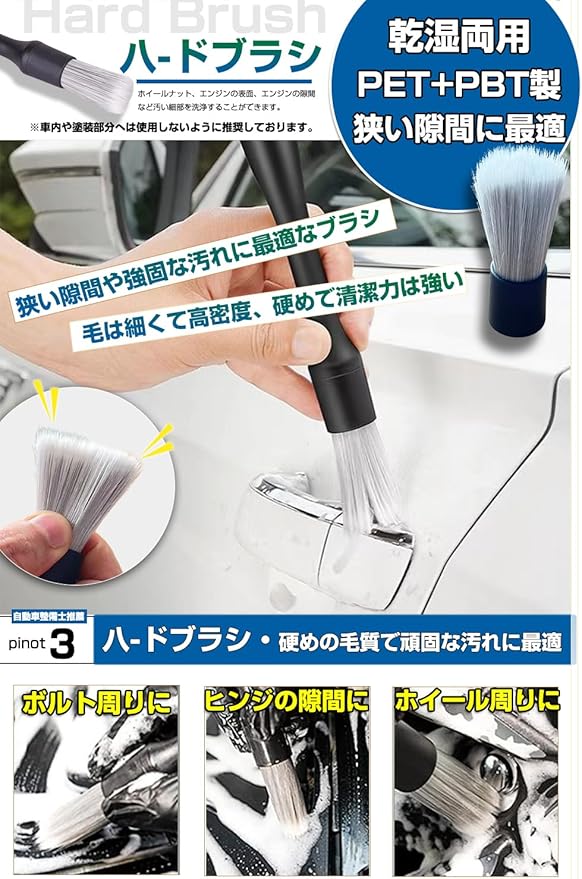 【自動車整備士推薦 5種類 5本セットの洗車ブラシ】:✅【ソフトブラシ】: 柔らかいブラシを使用すると、傷を効果的に防ぐことができます。✅【ミディアムブラシ】: 豚毛ブラシ。主に車のロゴ、車のグリル、ヘッドライトの隙間、車体の隙間などのやや硬い部分の清掃に使用されます。✅【ハードブラシ】: ハードの洗車ブラシで狭い隙間や強固な汚れに最適なブラシ。✅【マイクロブラシ】:車のエンブレム、レター、ヘッドライトの隙間、車体の隙間など汚れをピンポイントで除去できます。✅【ソフトブラシ車内用】主にエアコンの出口、ハンドルの隙間、シートの隙間、革の表面などに使用できます。