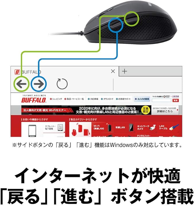 バッファロー USB マウス 有線 5ボタン 静音 【 戻る / 進む ボタン搭載 】 BlueLED BSMBU19BK
