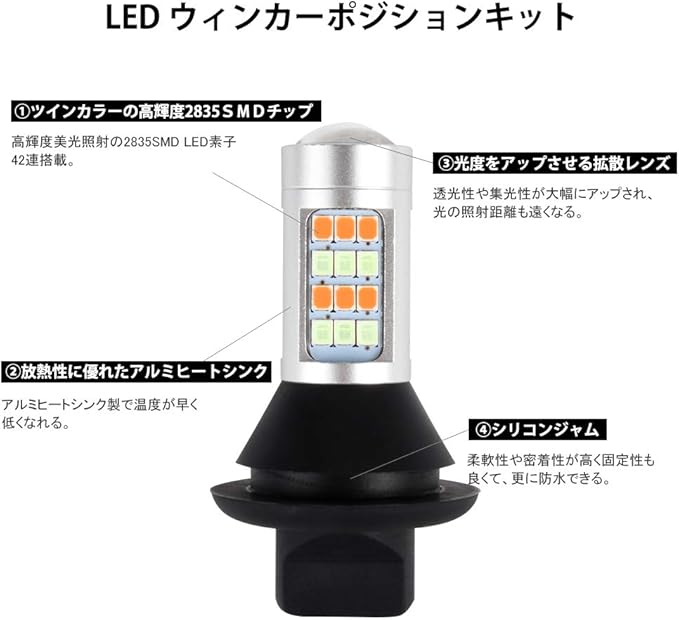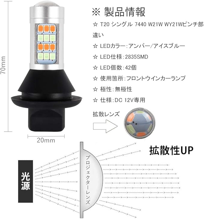 『商品仕様』口金タイプ:T20 シングル 7440 W21W WY21W ピンチ部違い / 発光色:アンバー&アイスブルー / LEDチップ:2835SMD / LEDチップ数:42連 / 入力電圧:DC12V / 消費電力:(ポジション)0.228A 12V=2.736W、(ウインカー)2.14A 12V=25.68W / 極性:無極性 /保証:100日保証。