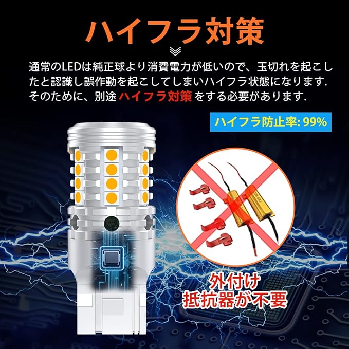 【ハイフラ防止機能内蔵】T20 LED ウィンカー 通常のLEDは純正球より消費電力が低いので、玉切れを起こしたと認識し誤作動を起こしてしまいハイフラ状態になります。そのために、別途ハイフラ対策をする必要があります。本製品は、小型のハイフラ抵抗をバルブ内に内蔵しているので、面倒なハイフラ対策・加工は必要がありません。