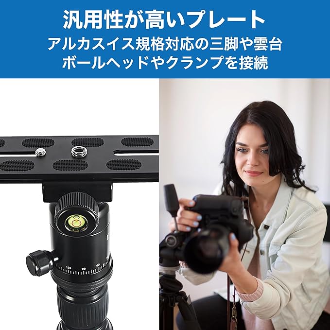 アルカスイス互換プレート:撮影のしやすさをワンランクアップさせられるアルカスイス互換のクイックリリースプレートです。プレートの表面には滑り止めのゴムが備わっているので、撮影時のブレも防げます。