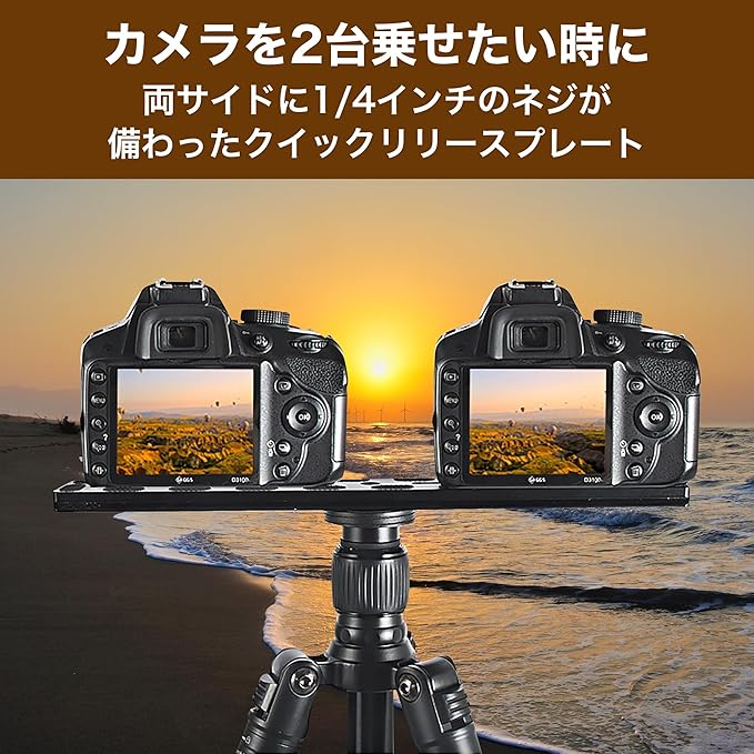 カメラを2台乗せたい時に:両サイドにそれぞれ1/4インチのネジが備わったクイックリリースプレートなので、三脚にカメラを2台乗せたい時にピッタリです。滑り止めゴム付きなので、接続面に傷がついてしまう可能性も少ないです。