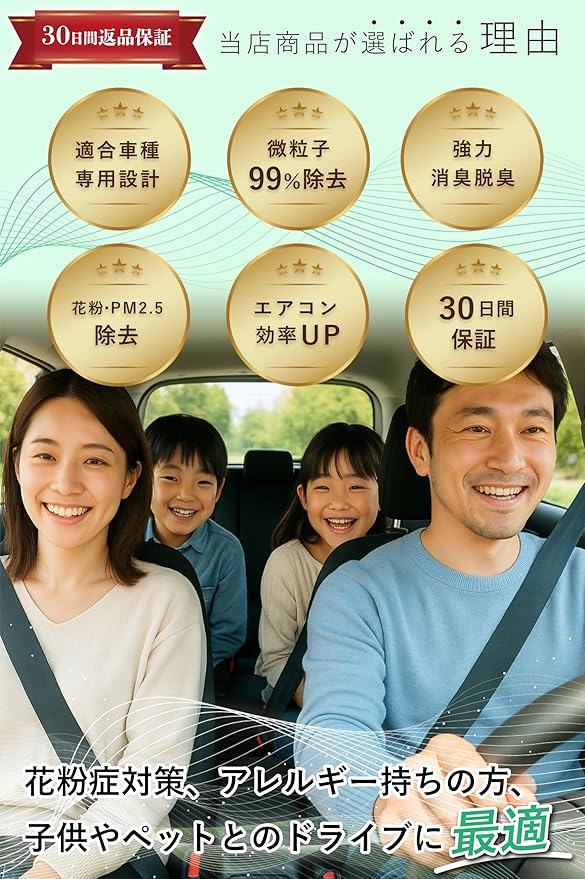 本製品はウイルス、アレル物質、花粉、粉塵、チリ・ホコリ、カビ臭・悪臭を取除くことができる消臭エアコンフィルターです。 純正のフィルターと交換するだけで、手軽に車内の空気をキレイにできます。 通気性を落とさずにPM2.5、花粉、チリ・ホコリ、カビの胞子、悪臭、菌、ウイルス、アレル物質を取り除きます。 不織布に織り込んだ活性炭が、排ガス臭・タバコ臭・カビ臭・ペット臭などの悪臭成分に吸着し、強力に脱臭します。