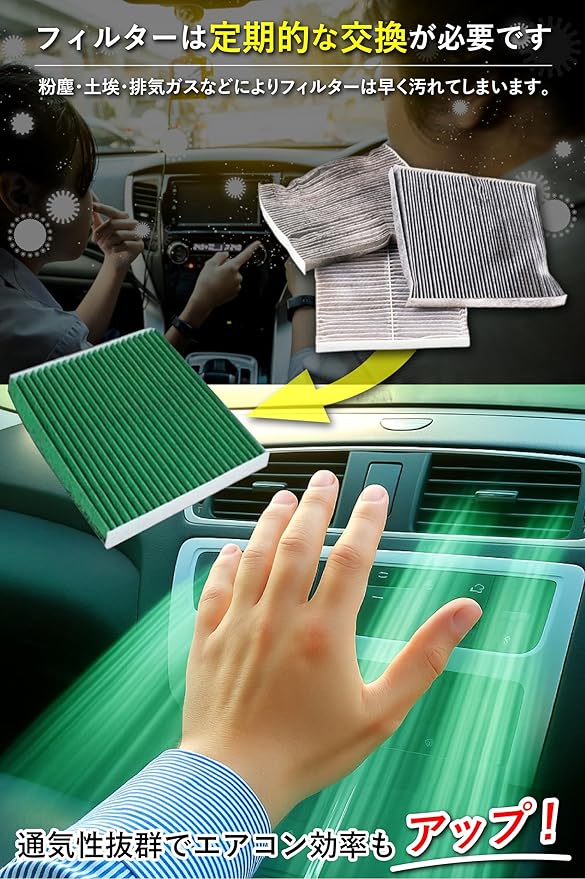 エアコンのフィルターを交換することによりフィルターの詰まりが解消されエアコンがよく効くようになります。常にクリーンば空気で快適な車内環境が維持できます。自動車の車検時や点検時にも特に指定しなければエアコンのフィルターは車検を出したディーラーやモータースでは交換してくれません。また交換するときにも作業工賃も取られてしまいますのでDIYでの交換がおすすめです。簡単に取り外し、取付ができます。 ※取付方向は裏表はありますが縦横はありません。