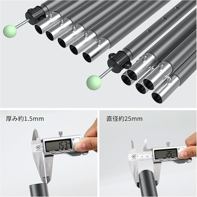 【7節分割式構造】直径25mm・厚さ1.5mm・最長240cm。分割式なので、使用後楽々に分解して保存できます。ポールの数によって、異なるタープのスタイル設営することができます。