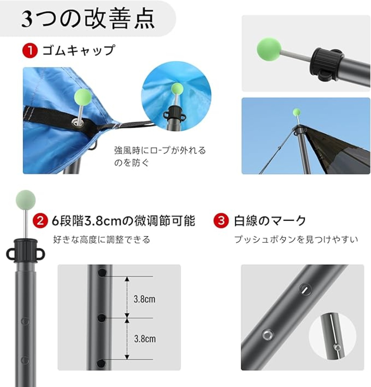 【ポッシュボタン式】プッシュボタン式で、差し込むだけでストッパーによって連結部分がしっかり固定されます。抜き出したり、差し込んだり、組立や撤収を簡単に行え、連結本数を変えることによって長さを調節しやすいです。