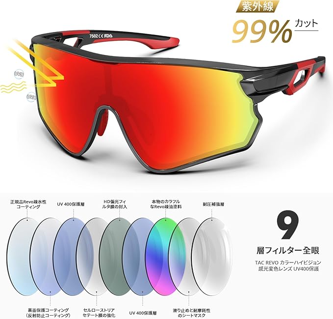 高品質TAC材料: すべての偏光レンズは高品質破砕防止TAC材料で作られており、十分に耐久性があり、長期的に着用することができます。軽量なTR90フレームの設計は、ランニング、野球、運転、釣り、登山、オートバイや自転車、レース、スキー、トレッキング、アウトドアなどに最適で、剃りにくく、壊れにくい。色彩豊かなレンズはファッションとスポーツを組み合わせ、男性と女性が着用するのに適しており、日本人のために設計されています