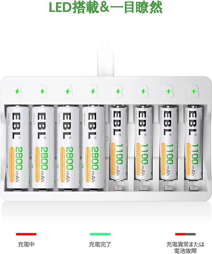 EBL 電池充電器 単3 単4 ニッケル水素/ニカド充電池に適用 USB-Cケーブル充電 電池の充電1-8本自由対応可能 電池じゅうでんき単体 ニッカド充電器