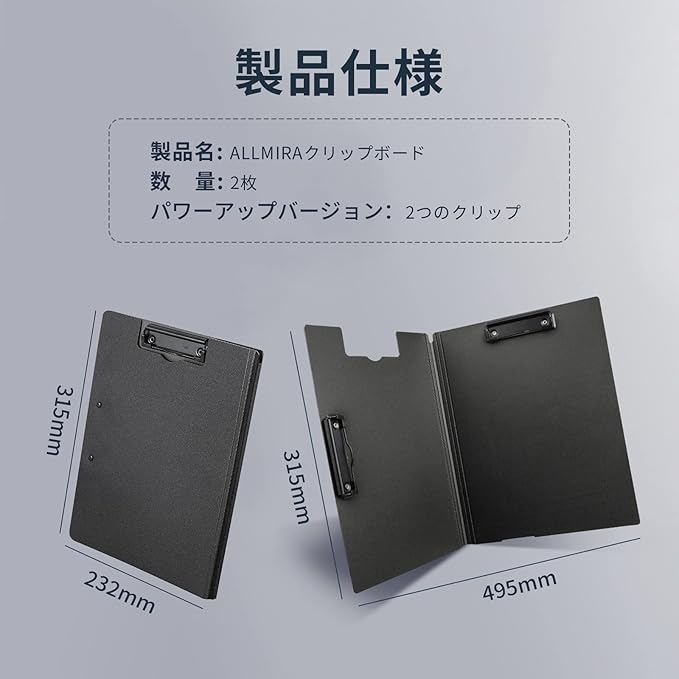 ALLMIRA バインダー a4 2つ折り 2個セット クリップボード 二つ折り クリップファイル 両面 ダブルクリップ 折りたたみ おしゃれ ふたつ折り (ブラック 2個入り)