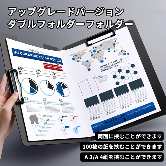 【ダブルクリップ設計】ファイルの両面各クリップがあり、クリップ力が強い、1~100枚のA4紙を挟んで、一枚で挟まれることもできます。