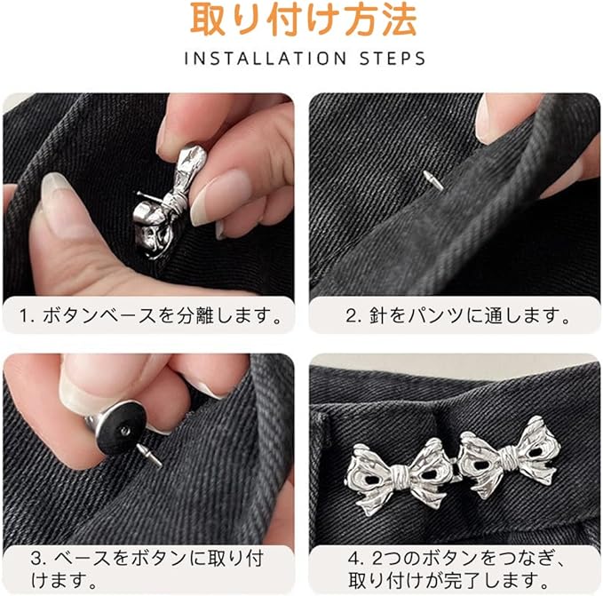 取り付け方法:2つの留め具リベットをズボンのウエスト部分に固定し、2つのバックルをつなぐことでズボンのウエストを短くすることができます。