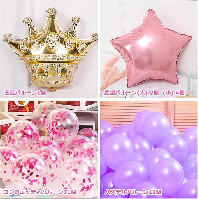 ♔セット内容(取り扱いの注意:対象年齢6+以上):①HAPPY BIRTHDAY 各1文字(40cm) ②クラウン(王冠)風船1個(45cm) ③紙吹雪風船10個(30cm)  ④星風船大2個(約45cm) ⑤星風船小4個(約12cm) ⑥カラー風船10個(約30cm) ⑦ドット型両面シール2個 ⑧リボン2個