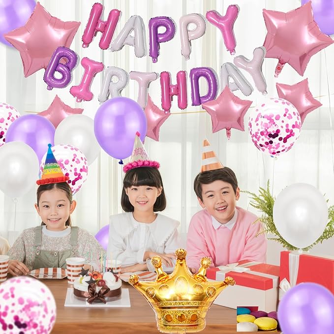 Lausatek バルーン 誕生日 風船セット バルーン バースデー HAPPY BIRTHDAY ガーランド 王冠マーク クラウン 星風船 飾り付け 装飾 パーティー サプライズ お祝い イベント 子ども 男の子 女の子 ピンク パープル