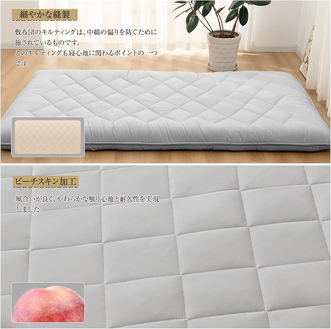 【心地よい肌触り・五層式敷布団】両面の表層はふわふわの中綿で、寝心地も抜群です。不織布は中棉とウレタンを分離し、中棉の形状を維持しやすく、つぶれず、耐久性があります。約5cmのウレタンが体を効果的に支え、敷き布団が崩れにくいです。ウレタンが入っていることで、全身をバランスよく支え、S字の寝姿勢を保ってくれ、快適に眠るとこができます。