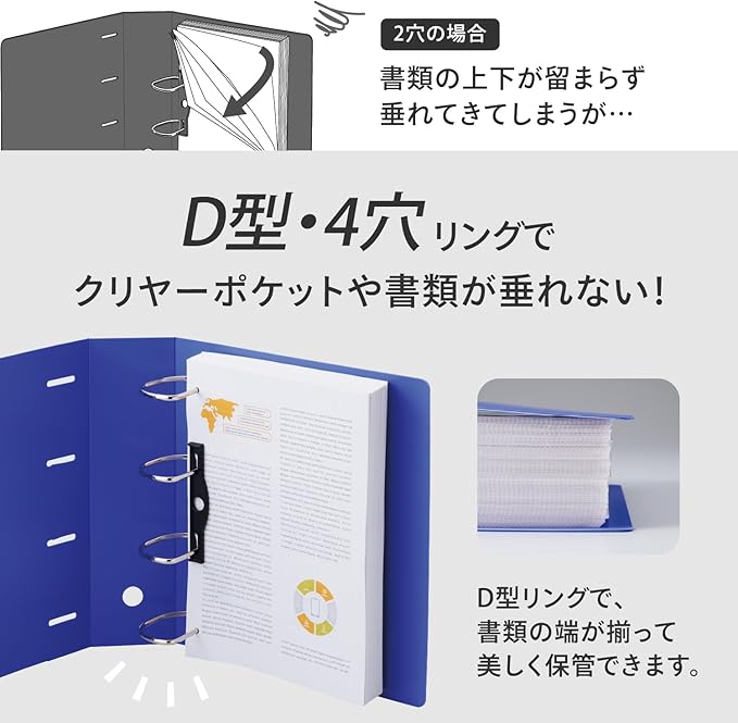 4穴のD型リングと書類をしっかり押さえる樹脂製の紙押さえが付いておりますので、ファイルを立てても書類やクリヤーポケットが垂れません。
