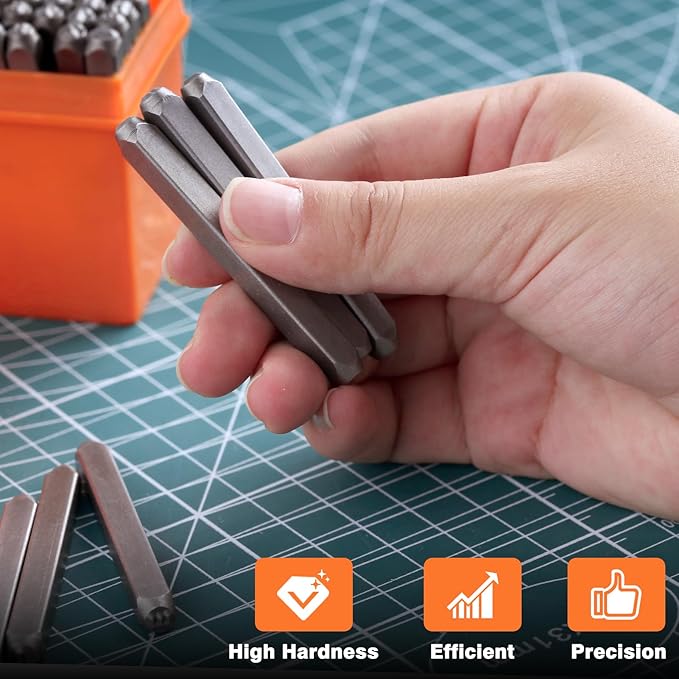 使いやすさ:金属製の文字スタンプと数字スタンプには、インパクトハンマービットとして使用できる1/8インチ(3mm)角のシャンクがあります。スタンプを置き、ハンマーや木槌で叩くだけで、デザインを刻印できます。