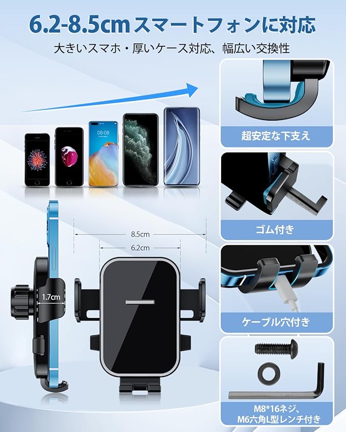 2.【セット内容】:ベースx1pcs、スマホホルダーx1pcs、ボールジョイントx1pcs、M8*16ネジ*1PCS、M6六角L型レンチ*1pcs【製品素材】:スマホホルダー:高品質ABS樹脂製 (耐高温)。ベース:耐熱PC素材。